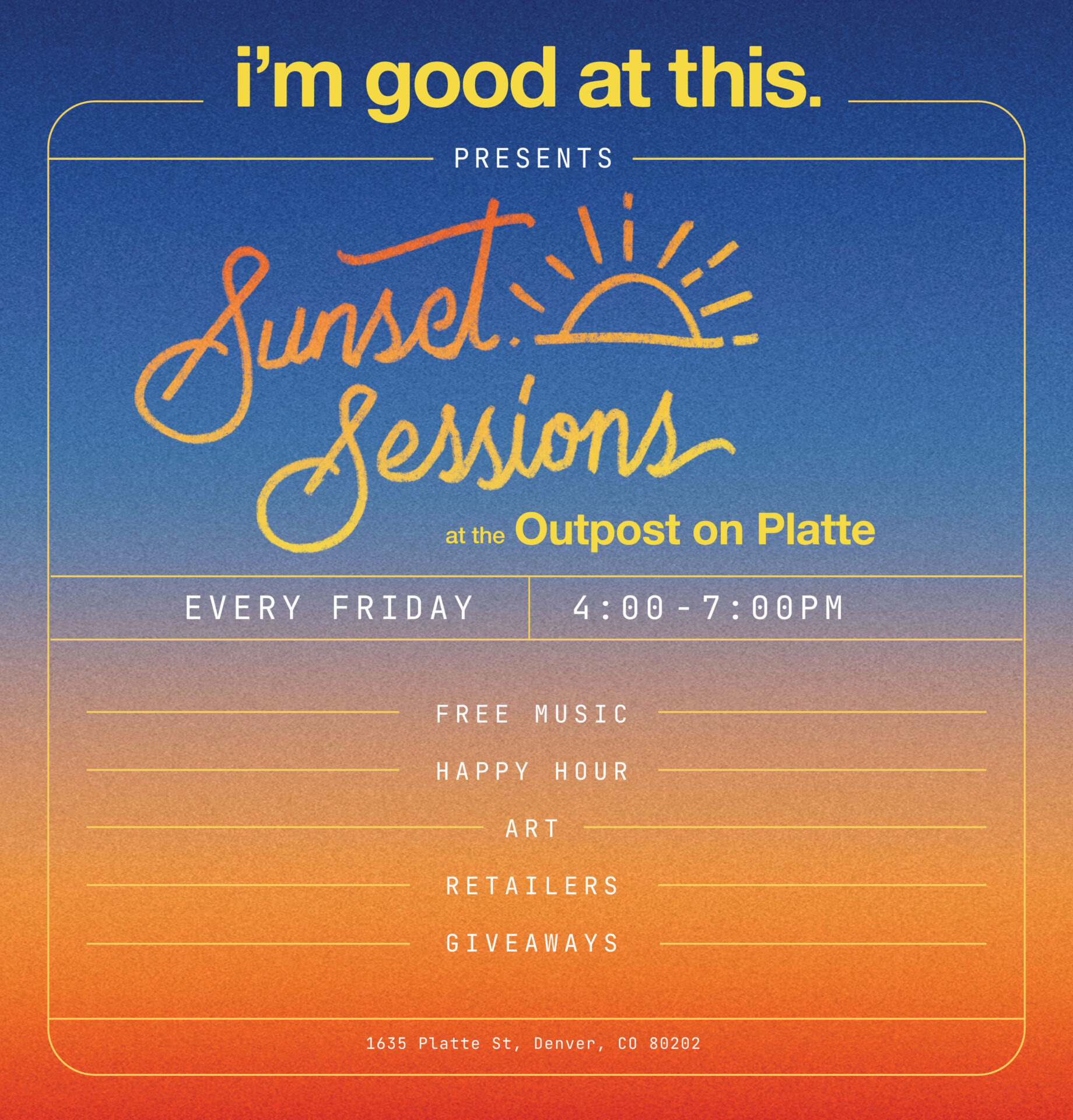 Description: Every Friday from April 17th to July 3rd, We’re kicking off the weekend with our FIRST FREE Concert Series at The Outpost on Platte. We’ve got Denver-based clothing brand, i’m good at this. installing a 12-week pop-up event. They are providing an music line-up, vendors, partnerships, and those immaculate pre-weekend vibes. It’s a HAPPY hour, it’s no-cost, there will be giveaways, and it’s for the whole community! Bring your friends, or meet new ones – either way, we look forward to meeting you!